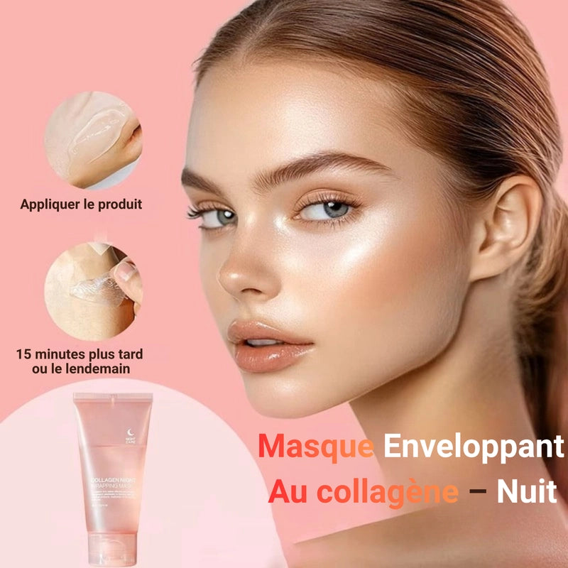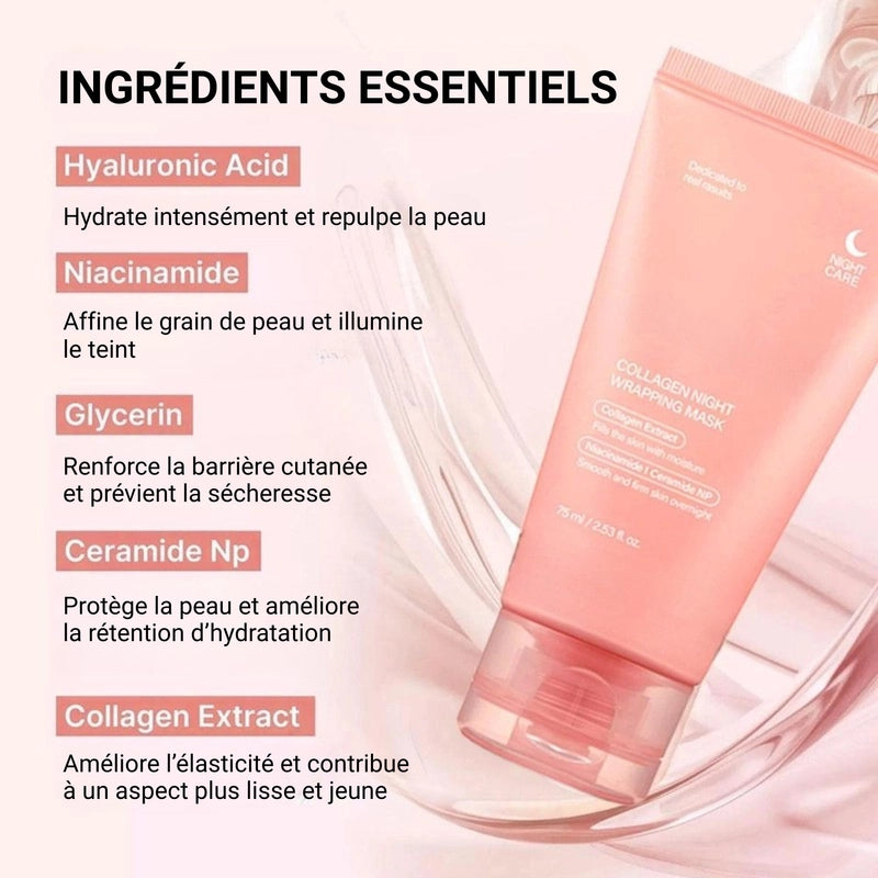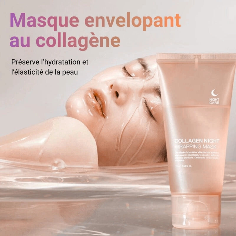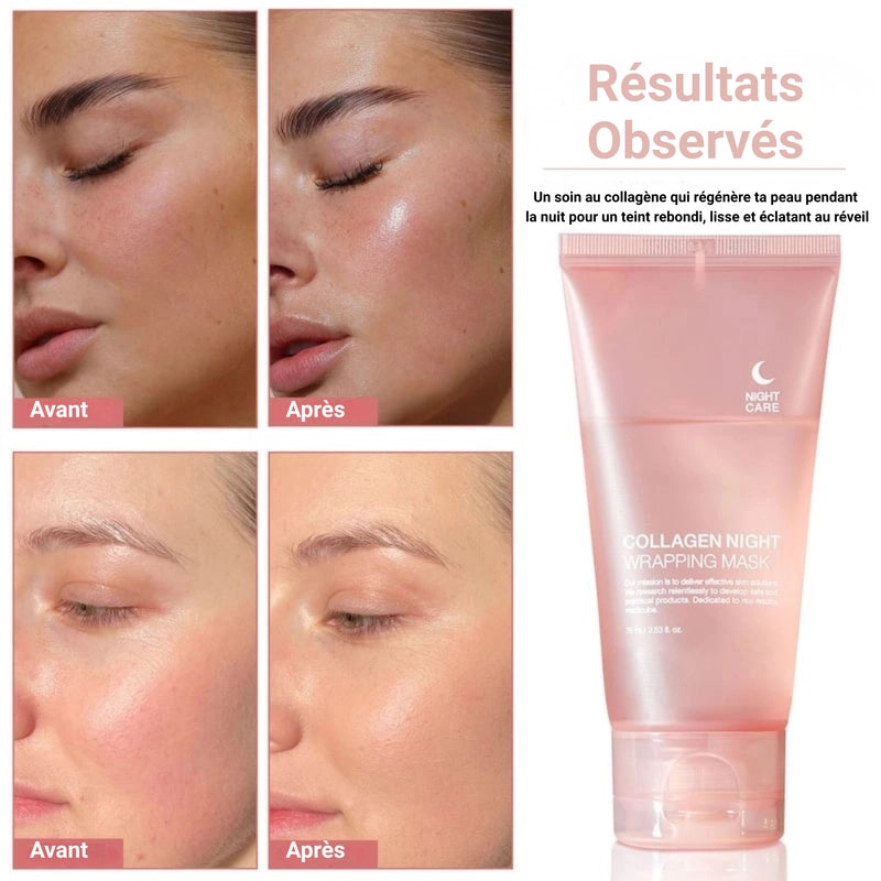 Pendant votre sommeil, notre masque agit comme un cocon protecteur. Le collagène et les actifs hydratants pénètrent en profondeur pour réparer et régénérer votre peau, la laissant repulpée et lumineuse au réveil. C'est votre secret beauté nocturne pour un teint parfait.